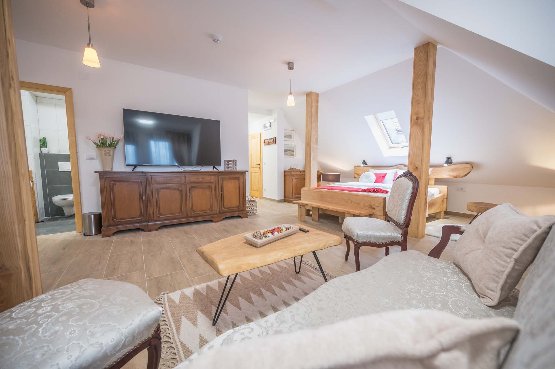 Doživite vrhunski odmor u našem luksuznom dvokrevetnom apartmanu koji nudi ne samo udobnost i stil, već i privatnu saunu idealnu za opuštanje nakon dana provedenog u istraživanju okoline. Ovaj elegantno uređeni apartman sadrži prostrani bračni krevet, moderno opremljeno kupatilo i zaseban prostor za sedenje. Apartman je opremljen najnovijim tehnološkim uređajima, uključujući visokokvalitetni Wi-Fi i pametni TV, što ga čini savršenim izborom za parove koji traže spoj avanture i relaksacije.