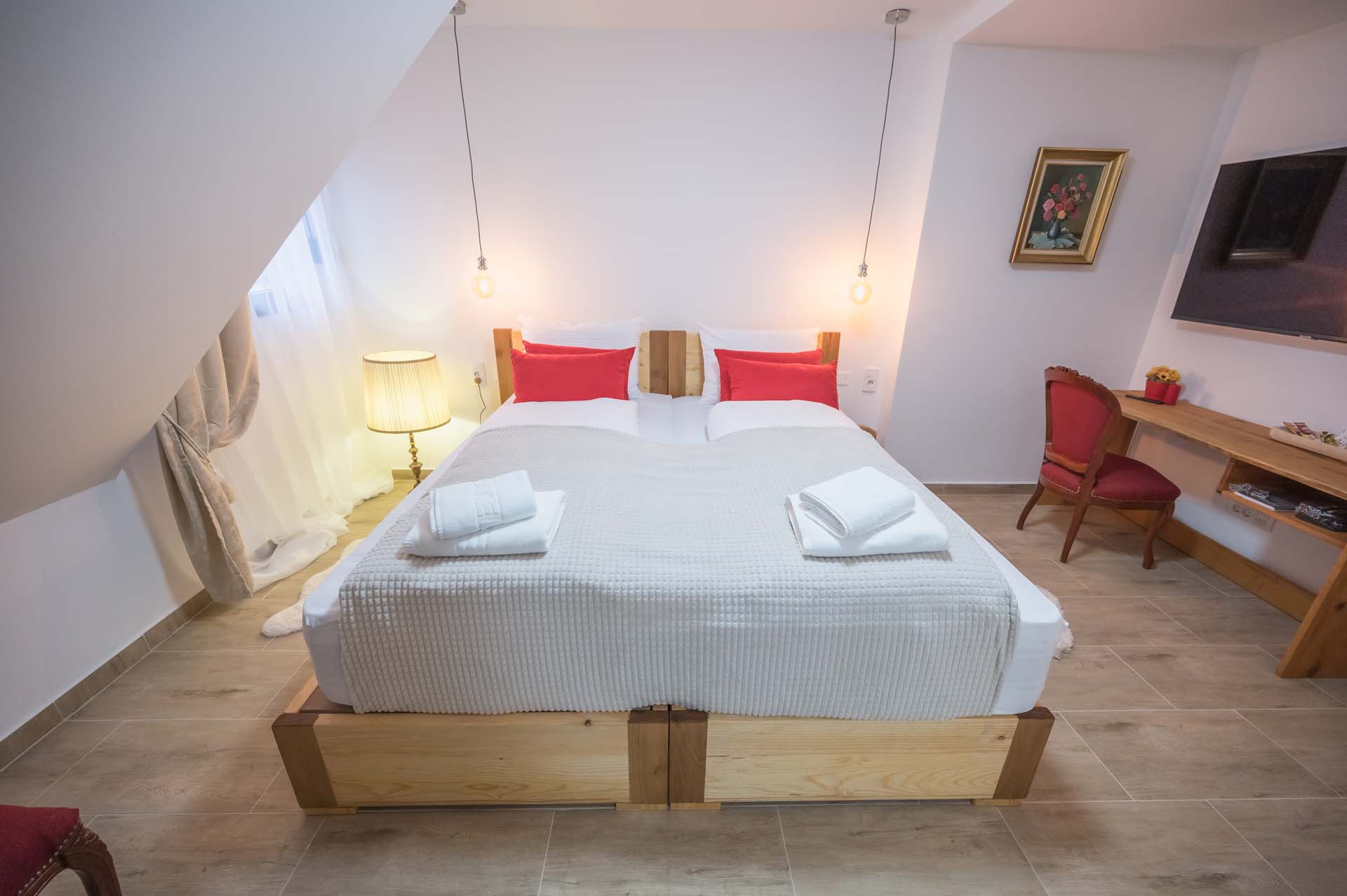 Doživite vrhunski odmor u našem luksuznom dvokrevetnom apartmanu koji nudi ne samo udobnost i stil, već i privatnu saunu idealnu za opuštanje nakon dana provedenog u istraživanju okoline. Ovaj elegantno uređeni apartman sadrži prostrani bračni krevet, moderno opremljeno kupatilo i zaseban prostor za sedenje. Apartman je opremljen najnovijim tehnološkim uređajima, uključujući visokokvalitetni Wi-Fi i pametni TV, što ga čini savršenim izborom za parove koji traže spoj avanture i relaksacije.